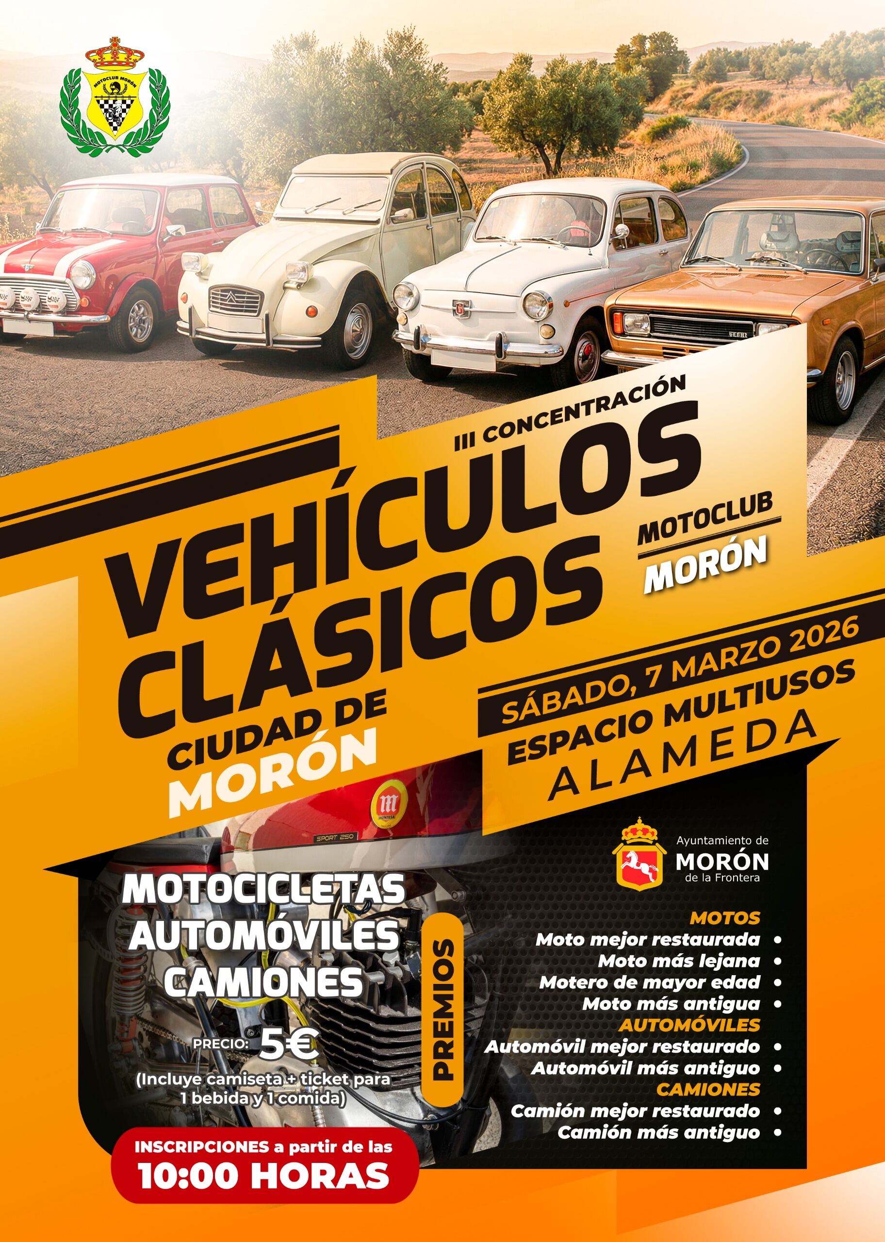El Real Motoclub Morón celebrará este sábado, 7 de marzo, su 50 aniversario con una jornada dedicada al mundo del motor que tendrá como escenario principal el Espacio Multiusos. El acto incluirá una exposición de material histórico, vehículos clásicos y un homenaje a las personas que han formado parte de la trayectoria de la entidad.