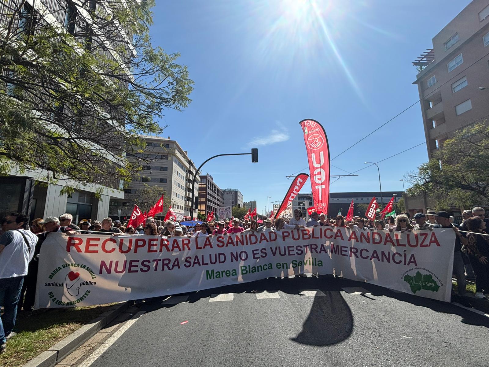Miles de personas, 50.000 según los convocantes, han recorrido las calles de Sevilla reivindicando una sanidad pública y universal en Andalucía y criticando las políticas de Moreno Bonilla y el PP que han desembocado en un deterioro de los servicios públicos. Se han escuchado cánticos a favor de la sanidad pública y contra la actuación en los cribados del cáncer de mama.