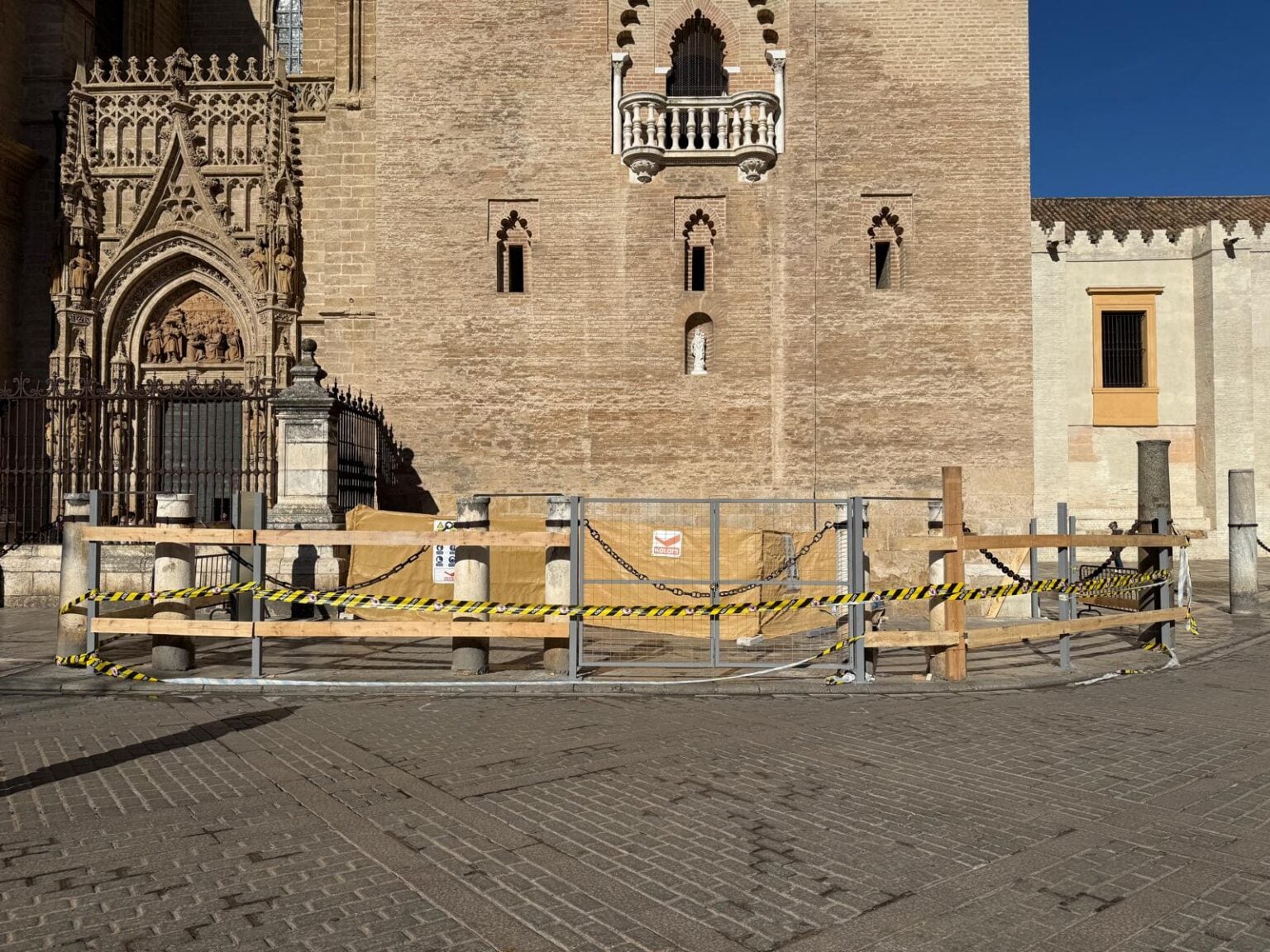 Tal y como estaba previsto, tras la Semana Santa, ha comenzado la instalación del cajón de obras lo que supone el inicio inminente de los trabajos correspondientes al remate renacentista de la Giralda.