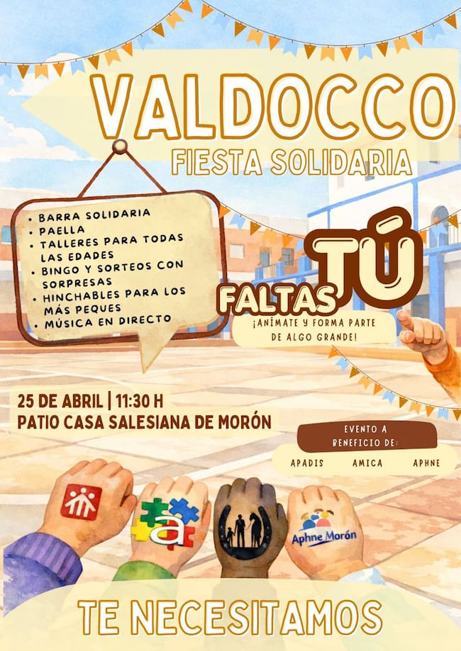El patio de la Casa Salesiana de Morón de la Frontera será escenario el próximo 25 de abril de la segunda edición de la fiesta solidaria Valdocco, una jornada que combinará convivencia, ocio y compromiso social con un objetivo claro: recaudar fondos y dar visibilidad a tres asociaciones fundamentales en la localidad como son APHNE, APADIS y AMICA.
