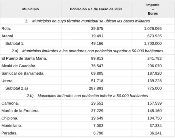 En el caso de los municipios donde se ubican las bases o su área más inmediata, Rota y Arahal concentrarán 1,7 millones de euros en total. La mayor parte corresponde a Rota, mientras que Arahal supera los 680.000 euros.