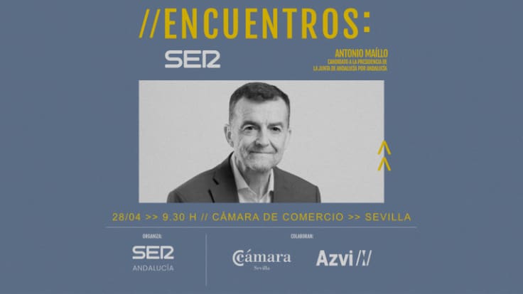 A escasos días del inicio de la campaña electoral, la Cadena SER Andalucía organiza esta semana una serie de de foros con los distintos candidatos a la presidencia de la Junta de Andalucía. El primer 'Encuentro SER' de la semana será con Antonio Maíllo, el postulante de Por Andalucía este martes 28 de abril a partir de las 9:30 horas. El acto tendrá lugar en el salón de actos de la Cámara de Comercio de Sevilla, en la plaza de la Contratación.