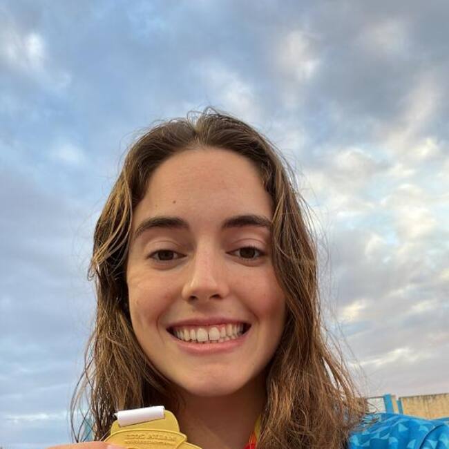 Nàdia Tudó amb la medalla d'or aconseguida als 200 metres braça als Jocs dels Petits Estats de Malta 2023. / FAN