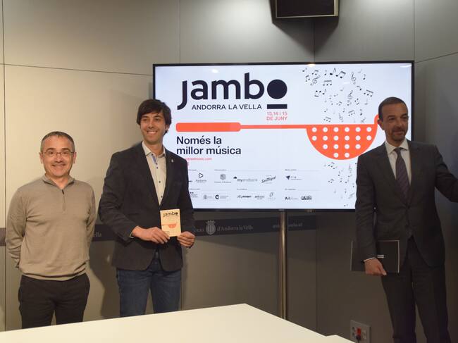 El ministre de Turisme i Comerç, Jordi Torres, i el cònsol major d'Andorra la Vella, Sergi González, amb els organitzadors del Jambo, Oriol Vilella i Toni Colom / ANA