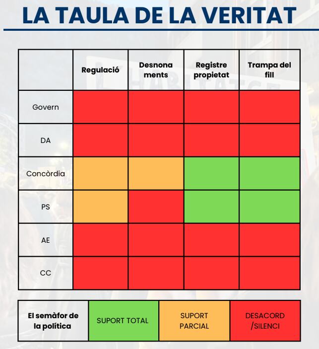 Només aquestes dues formacions han respost la carta que la plataforma ciutadana els va enviar per conèixer la seva posició sobre les principals propostes que tenen per abordar la problemàtica de l'habitatge, i no estan plenament satisfetes amb cap de les dues. De fet, els dos partits només en comparteixen dues: que són la creació del registre de la propietat i el fet d'aplicar més controls per lluitar contra la trampa del fill, però, en canvi, discrepen amb la limitació dels preus i amb el fet d'atorgar més protecció de la que ja s'ofereixen en cas de desnonament.