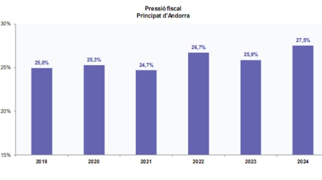 Així consta en el darrer informe publicat pel departament d'Estadística, elaborat a partir de l'estimació avançada del PIB nominal de l'any passat i el tancament dels ingressos tributaris. D'aquesta manera, conclou que la pressió fiscal va ser 27,5%, quan l'any anterior s'havia quedat al 25,9%. També especifica que es van meritar més de mil milions d'euros en impostos, a partir d'un PIB que va superar els 3.700 milions.