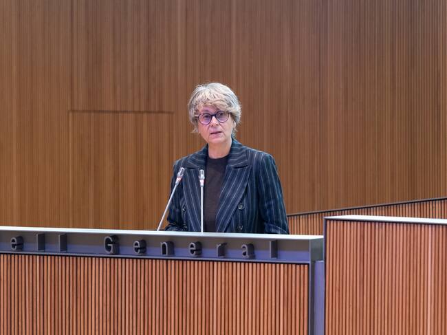 La presidenta del grup parlamentari socialdemòcrata, Susanna Vela, defensant l'esmena a la totalitat al pressupost del 2026 / ANA