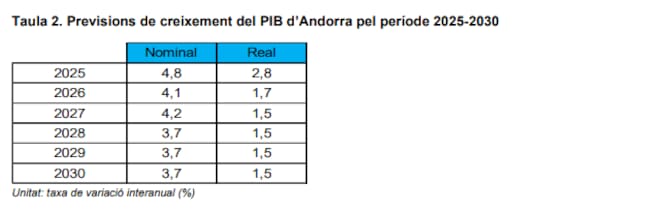 Així consta en l'informe sobre les previsions macroeconòmiques que ha elaborat el departament d'Estadística i que abraça el període entre el 2025 i el 2030. Segons detalla, Andorra tancarà aquest any amb un increment del PIB del 2,8%, que caurà fins a l'1,7% durant el vinent, i es mantindrà en l'1,5% fins d'aquí a un lustre.