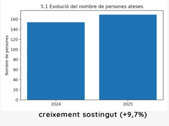 L'entitat ha publicat la Memòria d'Impacte Social i Econòmic 2025 i destaca aquestes 169 persones ateses, que són 15 més que l'any anterior, amb 122 visites de seguiment associades, un fet que els consolida com un recurs de proximitat en l'acompanyament de les addiccions, tan en primera persona com en el suport a famílies i entorns. Els grups de treball en l'àmbit penitenciari han acollit 37 participants, mentre que 39 persones han participat en els tres que mantenen sobre el territori.