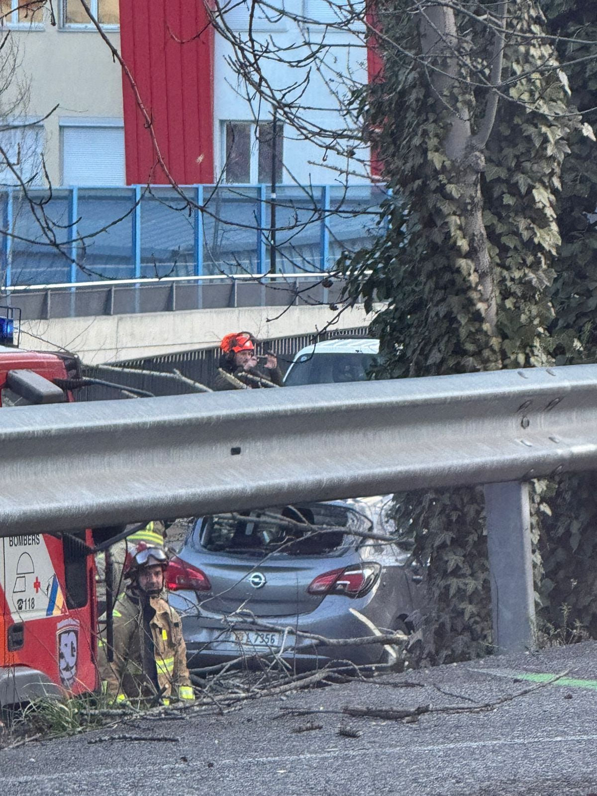 Bombers retirant cotxes i restes d'abres caiguts pel fort vent a l'avinguda Salou d'Andorra la Vella / Ràdio SER Principat d'Andorra