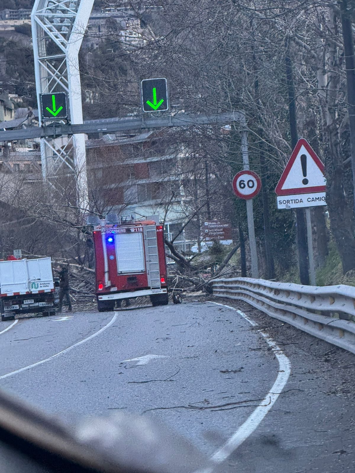 Un camió de bombers intervenint per la caiguda d'abres a l'Avinguda Salou d'Andorra la Vella / Ràdio SER Principat d'Andorra