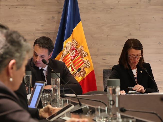 Els cònsols d'Ordino, Maria del Mar Coma i Eduard Betriu, durant la sessió del consell de comú