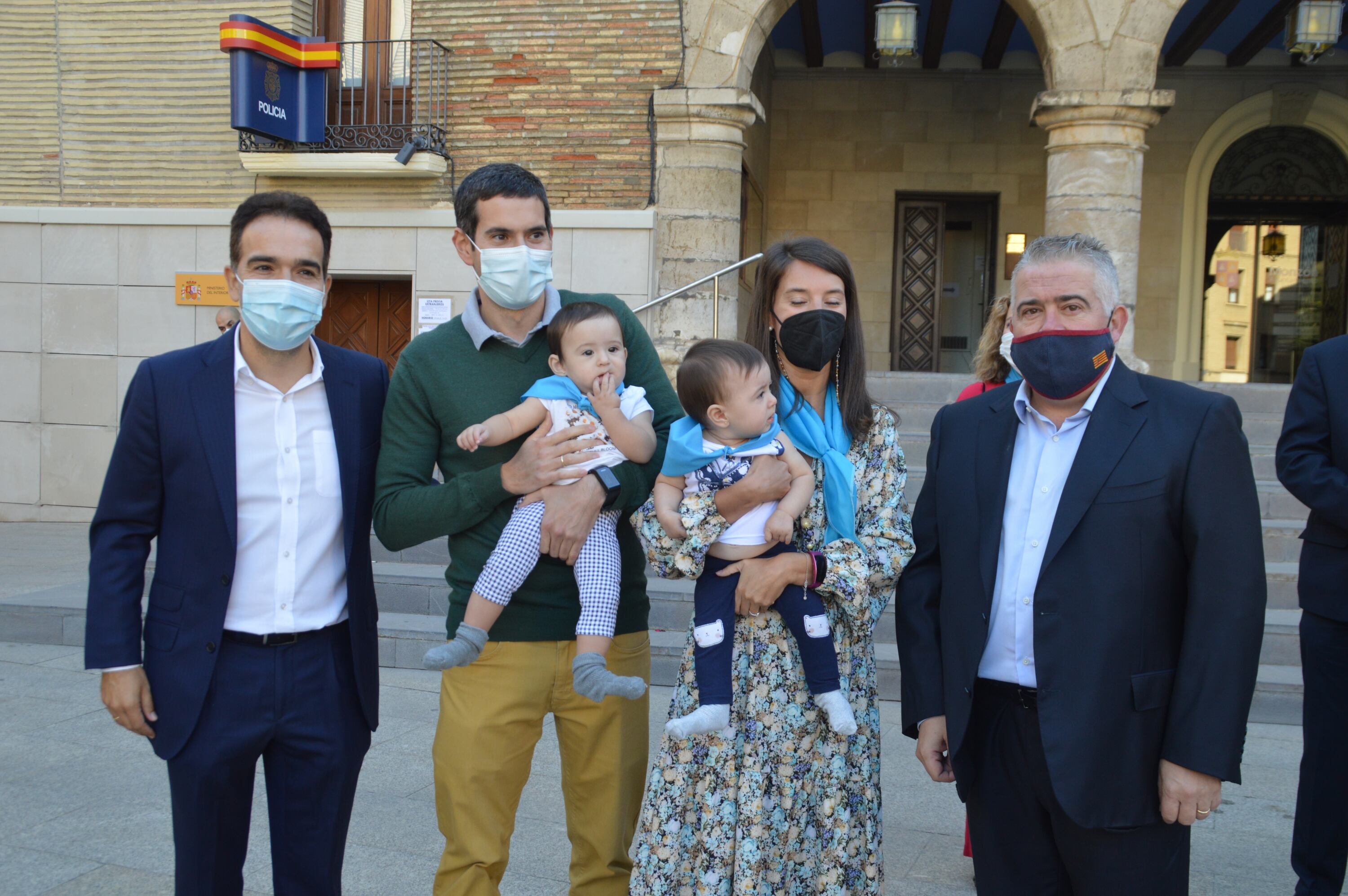 130 bebes nacidos entre 2020 y 2021 participaban en el acto “Mi primer San Mateo”, donde representantes de la corporación municipal les ponían la tradicional pañoleta azul. El acto se celebraba en la plaza Mayor de Monzón coincidiendo con el día del patrón, San Mateo.