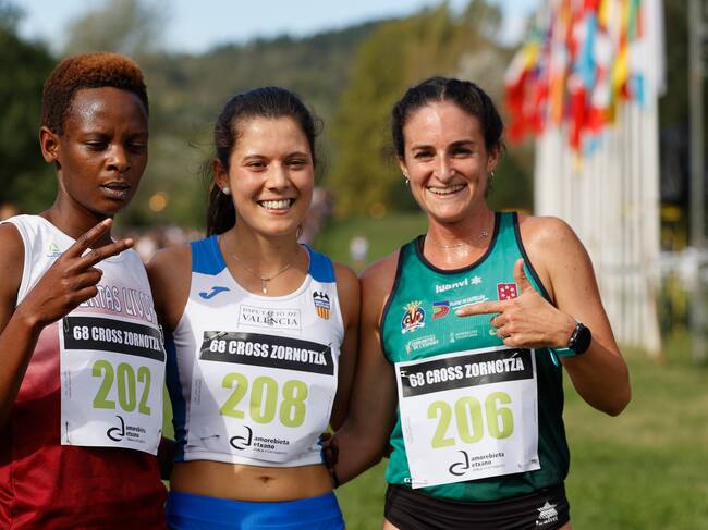 Las atletas Isabel Barreiro Nahimana Cavaline y Cristina Espejo celebran su primer, segundo y tercer puesto, respectivamente, en la 68 edición del cross internacional de Amorebieta, este domingo. EFE/ Luis Tejido / Luis Tejido (EFE)