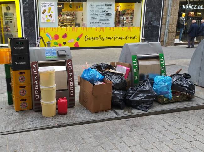 Imagen de basura dejada junto a los contenedores fuera del horario de recogida en pleno Coso Bajo de Huesca