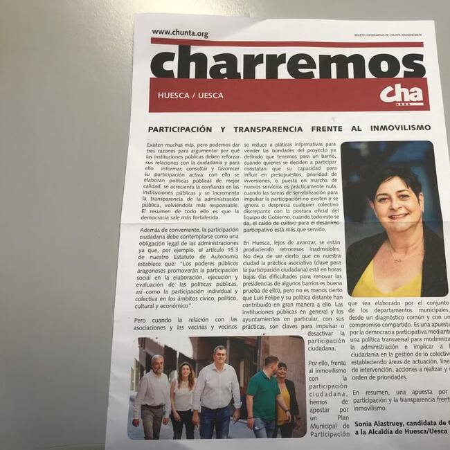 Chunta Aragonesista ha buzoneado por la ciudad de Huesca un nuevo número de su boletín informativo, "Charremos". En él, recoge varios artículos en los que muestran el trabajo de esta formación política en los últimos meses, y que pasa en muchos casos por reclamaciones de diferentes actuaciones a las administraciones, en especial al Ayuntamiento de Huesca.