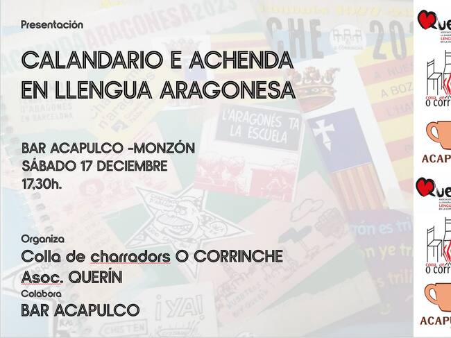 Este sábado, a las 17:30, el Bar Acapulco acoge la presentación del calendario de 2023 desarrollado por la Asociación O Corrinche (emigrantes aragoneses en Barcelona) y la Asociación Cultural para la promoción y la enseñanza de la lengua aragonesa en el Cinca medio, Querín.