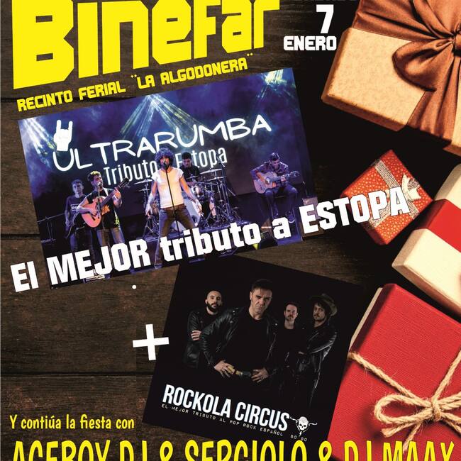Para el 7 de enero, el área de Actos Populares y Tradiciones del Ayuntamiento de Binéfar, que organiza los actos, ha preparado un concierto, que tendrá lugar en el Recinto Ferial, con el grupo Ultrarumba, considerado el mejor tributo a Estopa, que comenzará a las 23.30 h –aunque se abrirán puertas a las 22.30 hy que incluirá la actuación de Rockola Circus, grupo de versiones de música de los 80 y 90, así como de Aceboy Dj, Sergiolo y Dj Maax. La entrada anticipada será de 10 euros y en taquilla de 12 euros, aunque los peñistas y los alumnos de la Escuela Municipal de Música podrán adquirirla a precio reducido el día 4 de enero de 19.00 a 21.00 h en la Estación de Autobuses.