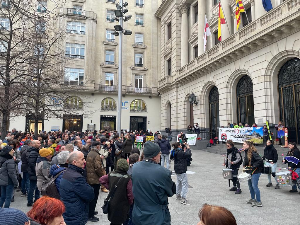 Varios centenares de personas se han concentrado este martes en la plaza de España de Zaragoza en contra de la firma de la unión de estaciones de Astún y Formigal. Los manifestantes afirman que quieren agotar las vías administrativas antes de llegar a las judiciales.