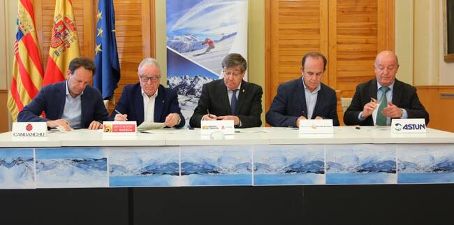Gobierno de Aragón, Mancomunidad del Valle del Aragón, Diputación Provincial de Huesca y las estaciones de Astún y Candanchú han firmado el convenio para la unión de estas dos estaciones, cuya obra deberá estar terminada en un 75% en diciembre del próximo año 2024. Los firmantes consideran que este proyecto es necesario para ser competitivos.