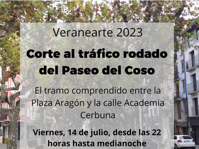 . Con motivo de la celebración esta noche de una de las actuaciones de Veranearte 2023, se verá afectado el tráfico rodado por el centro de la ciudad, en concreto por el Paseo del Coso.