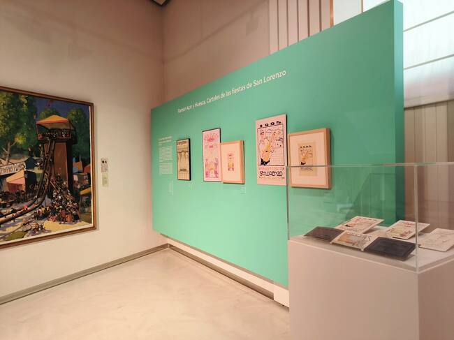 La muestra recoge varios carteles y programas que realizó para las fiestas de San Lorenzo, así como algunas de sus viñetas publicadas en los periódicos