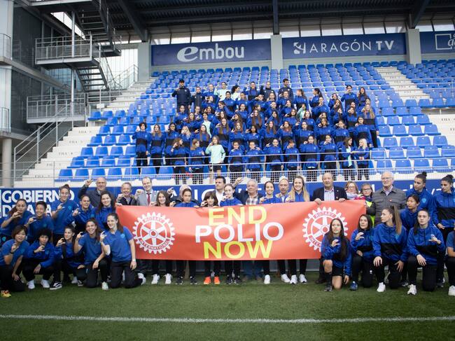 El Club Rotay Huesca ha organizado este acto en el propio césped del campo azulgrana donde todas las chicas que componen la sección de fútbol se han fotografiado como muestra de apoyo junto con los representantes del Rotary. En la pancarta se podía leer fin a la polio (Polio End Now).