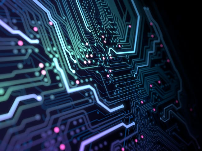 Circuit board with running data by a glowing lines. / Yuichiro Chino