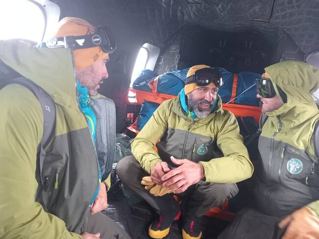 Los expedicionarios, durante el vuelo en el helicóptero que les ha sacado de O’Higgins para reorganizar la expedición ante la mala situación meteorológica. ©GMAM OCP EMMOE