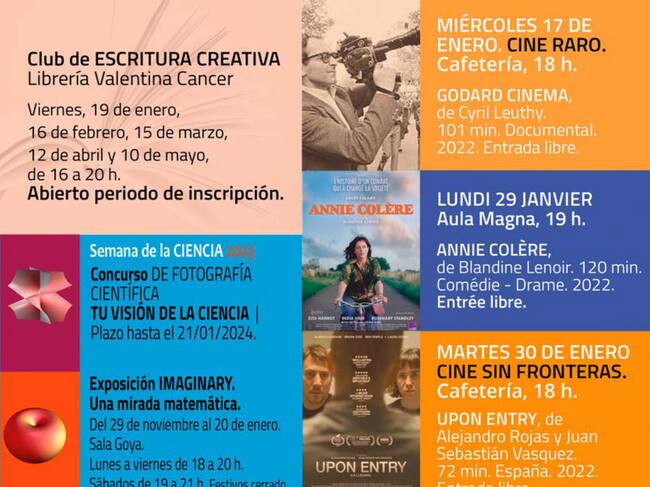 Para finalizar el mes, la UNED ofrece doble sesión de cine. El 29 de enero, en versión original "Annie Colère" de Blandine Lenoir. Una tragicomedia francesa del 2022 que se proyectará a las 19 horas en el Aula Magna. Por su parte, el 30 de enero, se ha programado la película "Upon Entry" de Alejandro Rojas y Juan Sebastian Vásquez. Será a las 18 horas en la cafetería.