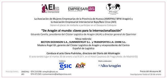 Tendrán lugar el próximo día 30 de enero con el objetivo de abordar la compleja situación actual para la internacionalización de las empresas aragonesas, y profundizar en las fortalezas y retos de los agentes del sector es el objetivo de la jornada “De Aragón al Mundo: Claves para la Internacionalización de la Industria”, organizada por las Asociación de Mujeres Empresarias de la Provincia de Huesca (AMEPHU/BPW ARAGÓN) y la Asociación Empresarial Intersectorial del Bajo Cinca (AEI), en colaboración con ESIC, el Clúster Logístico de Aragón (ALIA), y Diario del Alto Aragón como medio colaborador. La tercera edición de este evento, que da continuidad a las jornadas previas celebradas en Monzón y Sabiñánigo, será el martes 30 de enero a las 9,15 horas en el Hotel Casanova de Fraga.