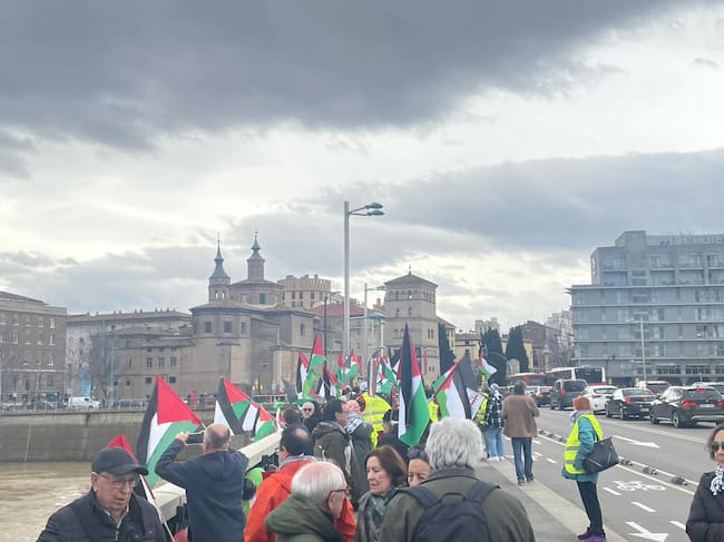 Más de 100 personas se concentraban esta mañana en el puente de Santiago de Zaragoza exigiendo el cese de la violencia de Israel en la Franja de Gaza. La cifra de palestinos muertos supera los 30.000, según el Gobierno de este país.