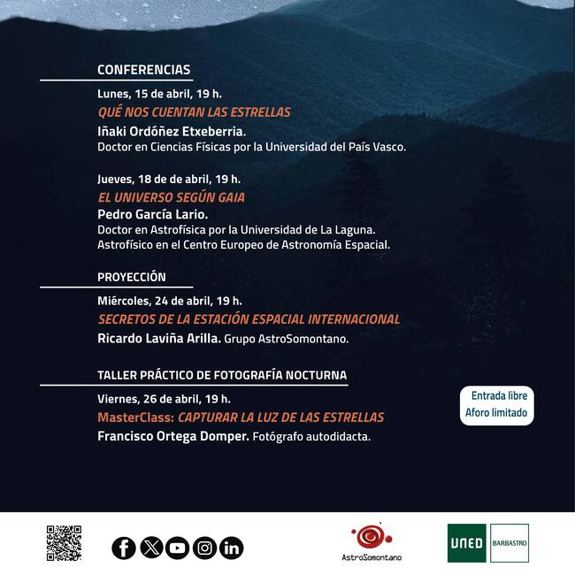 La UNED de Barbastro organiza en colaboración con AstroSomontano la tercera edición de la Semana de la Astronomía, qué se celebrará desde este lunes hasta el 26 de abril, en el Aula Magna del centro barbastrense.