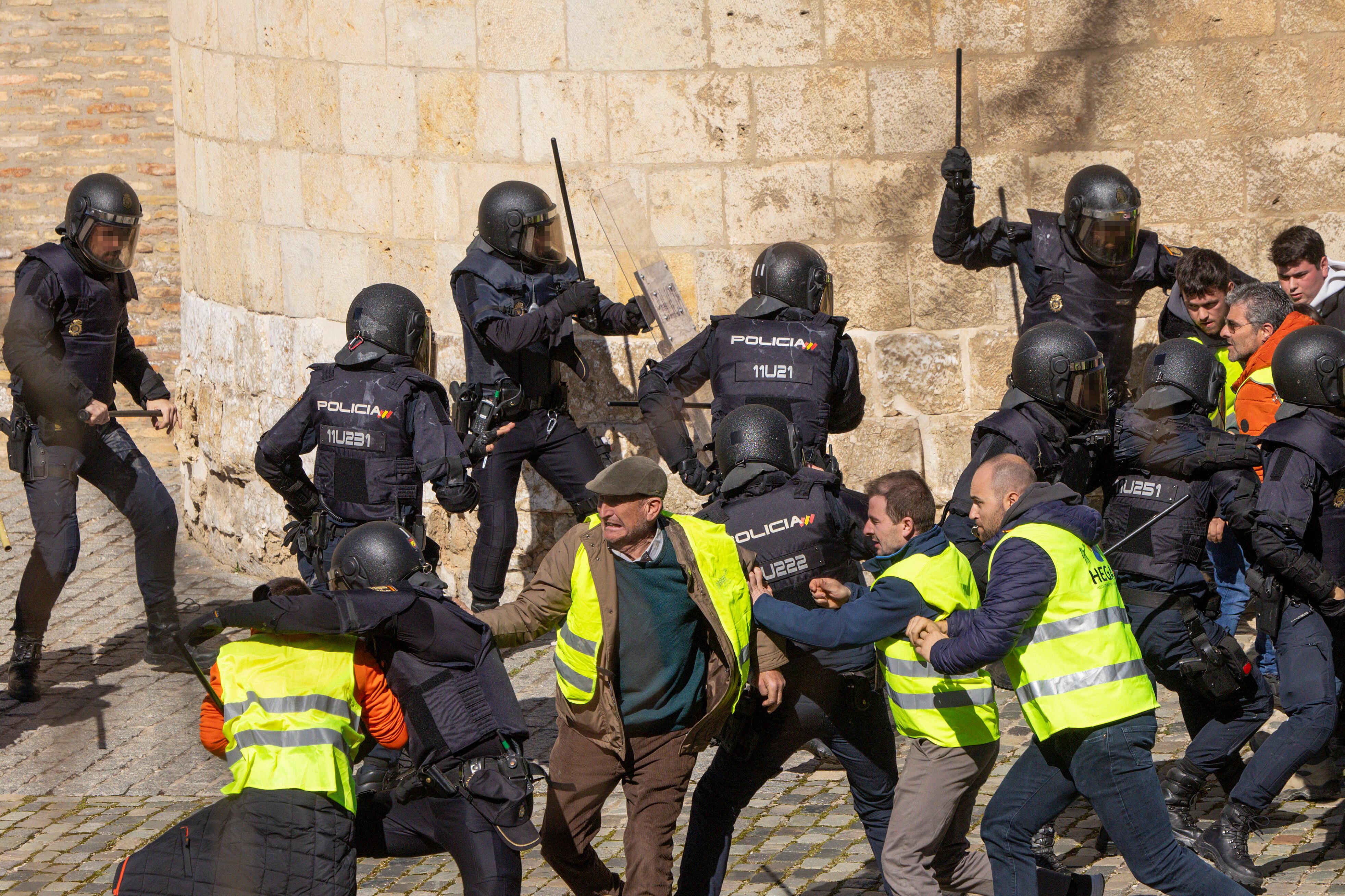 ZARAGOZA, 01/03/2024.- Agentes de Policía contienen a los agricultores que intentar acceder al Palacio de la Aljafería donde están las Cortes de Aragón, este viernes en Zaragoza. EFE/ Toni Galán / Toni Galan (EFE)