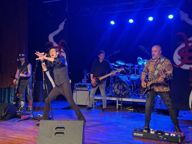 El Teatro Municipal de Los Titiriteros de Binéfar ha registrado esta noche prácticamente un aforo completo, con alrededor de trescientos espectadores, en la actuación de la mejor banda tributo de Héroes del Silencio, Derivas. Los zaragozanos, fieles a la estética rockera creada hace cuarenta años por Bunbury, Cardiel, Andreu y Valdivia, hicieron estremecer a un público entregado desde el primer acorde de himnos como ‘Maldito duende’, ‘Entre dos tierras’, ‘Héroe de leyenda’ y ‘La chispa adecuada’.