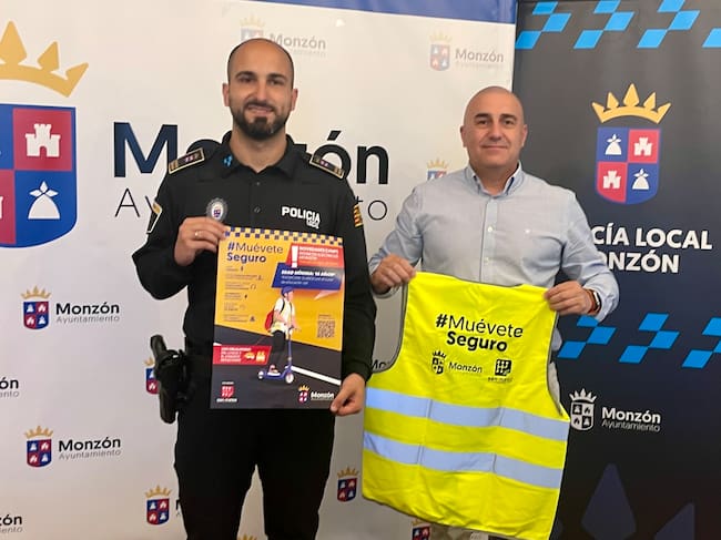 El concejal de Policía del Ayuntamiento de Monzón, Carlos Perella, y el jefe de la Policía Local, Daniel Saura, han presentado la normativa que va a regir, a partir del día 20 de mayo, en el uso de patinetes eléctricos (vehículos de movilidad personal) en Monzón en el marco de la campaña #MuéveteSeguro.
