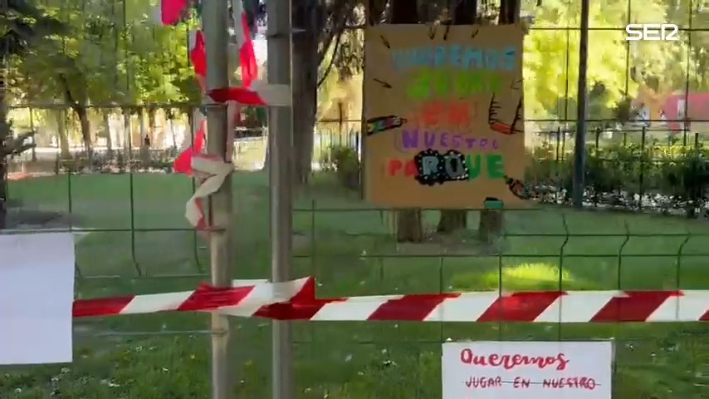 Carteles reivindicativos en la valla de la zona en la que se impide jugar a los niños