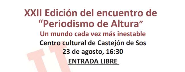 El Centro Cultural de Castejón de Sos acoge el viernes 23 de agosto el XXII Encuentro ‘Periodismo de Altura’, coordinado por el periodista ribagorzano y corresponsal de ABC en Bruselas, Enrique Serbeto. La cita, que comienza a las 16.30 h y cuenta con la colaboración de Periodistas de Aragón, pone el foco en la situación de Oriente Medio y en la visión local de los principales cambios en el mundo, con el título 'Un mundo cada vez más inestable'.