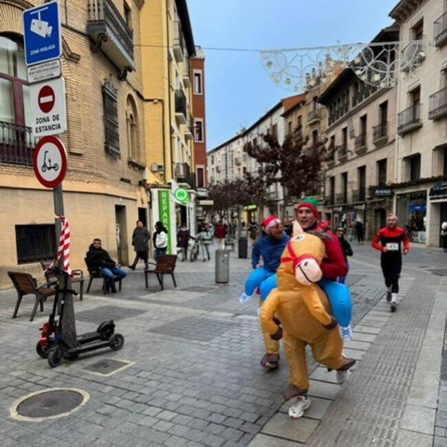 Los disfraces más originales, risas de niños y no tan niños y un sano sobrealiento. Así ha vivido la tarde de este martes centenares de oscenses la prueba San Silvestre, una cita social, lúdica y muy divertida que recuperaba este año el Club Deportivo Zoiti, pues llevaba desde 2019 sin celebrarse.