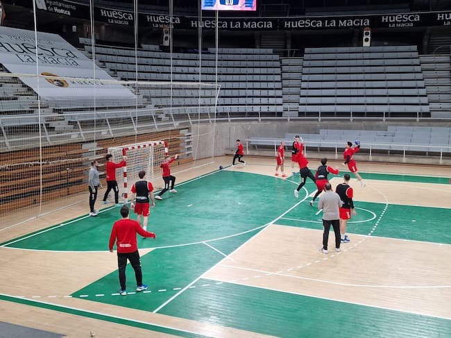 Bada Huesca durante un entrenamiento en el Palacio de los Deportes