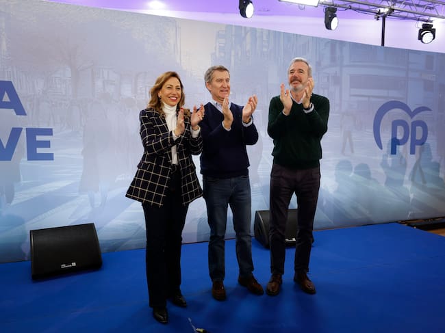 ZARAGOZA, 09/02/2025.- El presidente del PP, Alberto Núñez Feijóo (c), junto al presidente de Aragón, Jorge Azcón, y la alcaldesa de Zaragoza, durante la reunión que celebró este domingo en Zaragoza con 35 alcaldes populares de urbes de más de 100.000 habitantes, en el I Foro de grandes ciudades de España, que se centrará en la vivienda y servirá para reclamar también al Gobierno que aborde con los ayuntamientos la financiación local. EFE/ Javier Cebollada / Javier Cebollada (EFE)