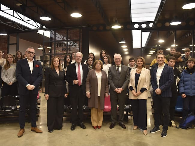 La visita del IES Baltasar Gracián de Graus a la empresa Eboca ha contado con la presencia de la consejera de Educación, Cultura y Deporte del Gobierno de Aragón, Tomasa Hernández; el director general de Fundación Ibercaja, José Luis Rodrigo, y el vicepresidente de Fundación Bertelsmann, Francisco Belil