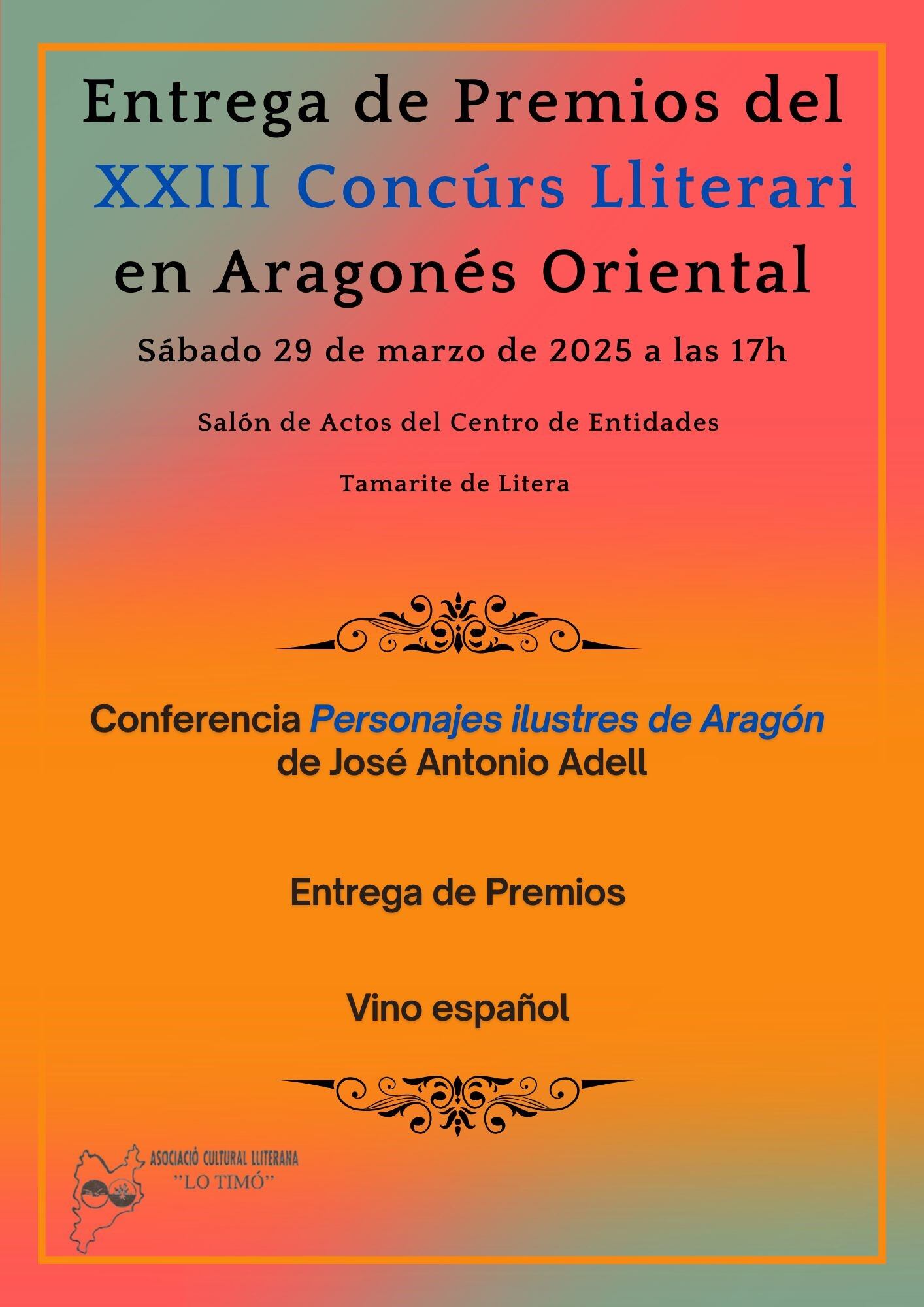 El acto, que tendrá lugar este sábado a las 17:00 horas en el centro de entidades, comenzará con una conferencia del escritor José Antonio Adell "Personajes ilustres de Aragón". Seguidamente, el presidente de la Asociación Cultural Lliterana "Lo Timó", Héctor Castro intervendrá para explicar el origen del aragonés oriental y del concurso literario, así como las características lingüísticas del habla de Tamarite de Litera. Posteriormente se entregarán los premios literarios correspondientes al concurso de 2024. El acto finalizará con un vino español para todos los asistentes.