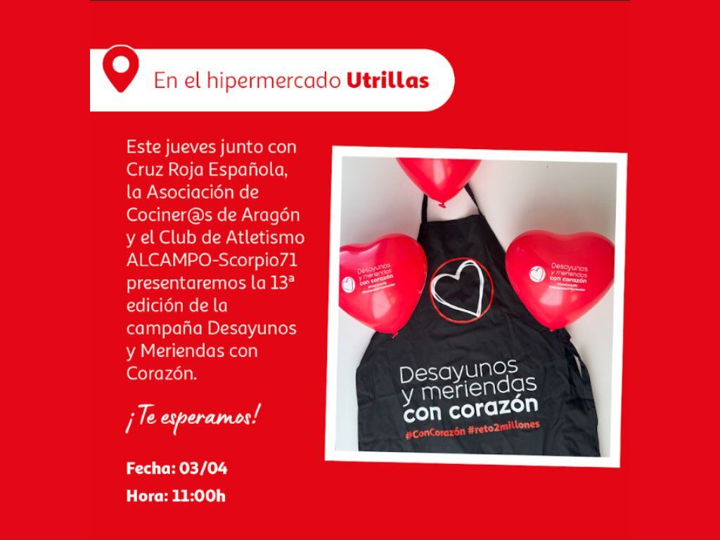 El próximo 3 de abril a las 11:00 horas, el hipermercado Alcampo Utrillas en Zaragoza acogerá la presentación de la 13ª edición de la campaña solidaria "Desayunos y Meriendas #ConCorazón". Esta iniciativa, organizada por Alcampo, Cruz Roja Española, la Asociación de Cociner@s de Aragón y el Club de Atletismo ALCAMPO-Scorpio71, busca movilizar a la sociedad para reducir la pobreza infantil y la desigualdad a través de la donación de tarjetas solidarias.