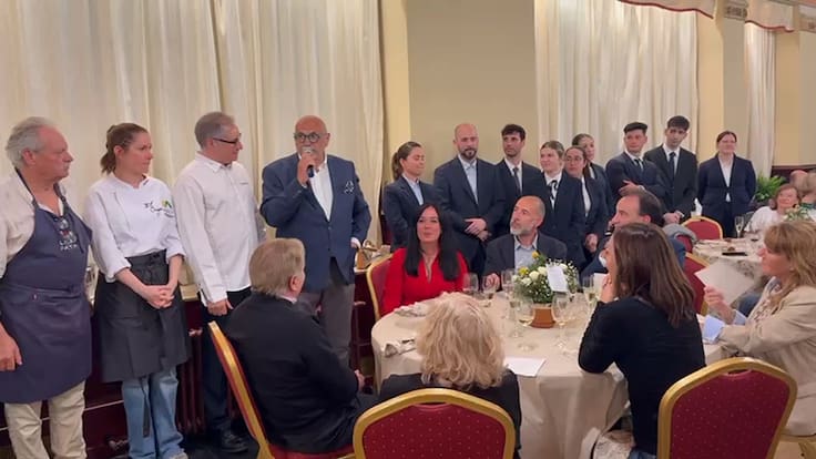 Carmelo Bosque, presidente de la Asociación Provincial de Hostelería, indicaba que se trataba de 12 platos en degustación, al tratarse de una cena, pero suficiente para que la gente disfrutase y pudiese llegar a comerlo todo con productos como el tomate rosa, el esturión de El Grado, un canelón de brandada de bacalao con azafrán, torteta, merluza, pularda de Poleñino con usones, y un postre que es muy especial, Teodoro, te adoro, en homenaje a Teodoro Bardají. Y además, vinos somontano y dulces de los artesanos pasteleros de Huesca.