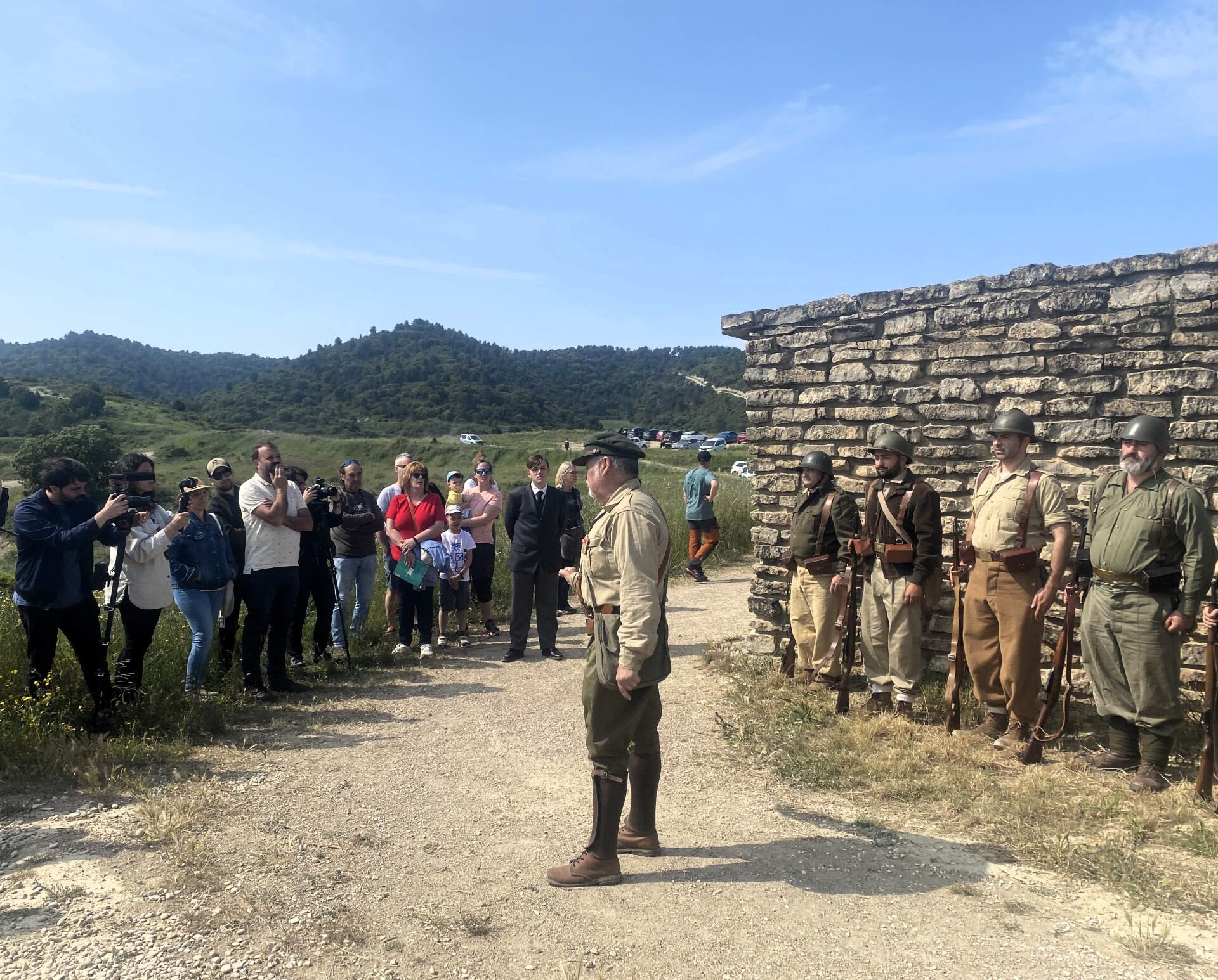 Un año más, la Trinchera Viviente de la Ruta Orwell colgó el cartel de completo en los siete pases que se desarrollaron a lo largo de la jornada en horario de mañana y tarde. El sol y las altas temperaturas acompañaron durante las visitas teatralizadas que se sucedieron en las trincheras rehabilitadas de la posición Monte Irazo. Un total de cincuenta recreadores históricos procedentes de diez asociaciones de distintas Comunidades Autónomas mostraron diferentes capítulos históricos de la guerra civil española.