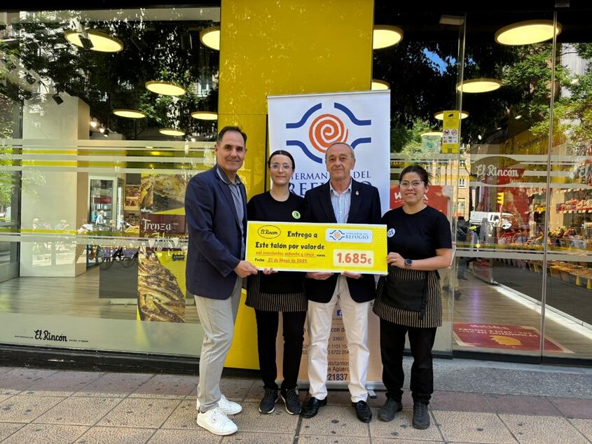 La cadena de tiendas El Rincón ha entregado un donativo de 1.685 euros a la Hermandad del Refugio de Zaragoza, fruto de una campaña solidaria llevada a cabo en los últimos meses. La recaudación se ha conseguido gracias a las aportaciones voluntarias de los clientes a través de huchas solidarias instaladas en sus establecimientos de Zaragoza, Huesca, Logroño y Madrid.