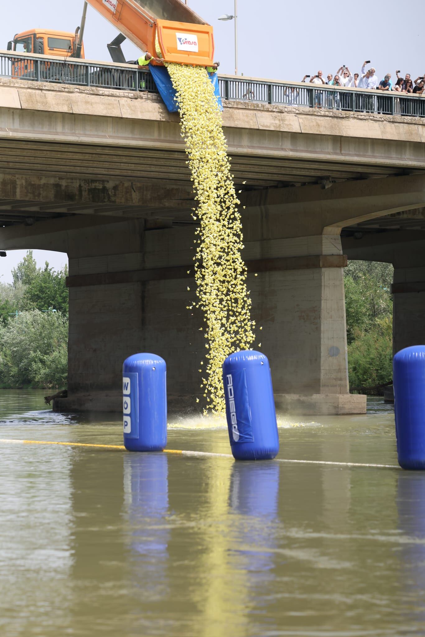 Un Ebro lleno de Patitos de goma. Esa es la imagen que ha podido verse este sábado en Zaragoza entre el Puente de La Almozara, donde ha tenido "la suelta", hasta el Puente de Santiago.