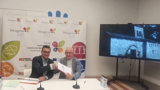 El presidente de la Comarca de Ribagorza, Roque Vicente, y el Obispo de la Diócesis de Barbastro-Monzón, Ángel Pérez, han firmado un convenio para la dinamización y promoción del patrimonio de la Diócesis en la Comarca de Ribagorza.