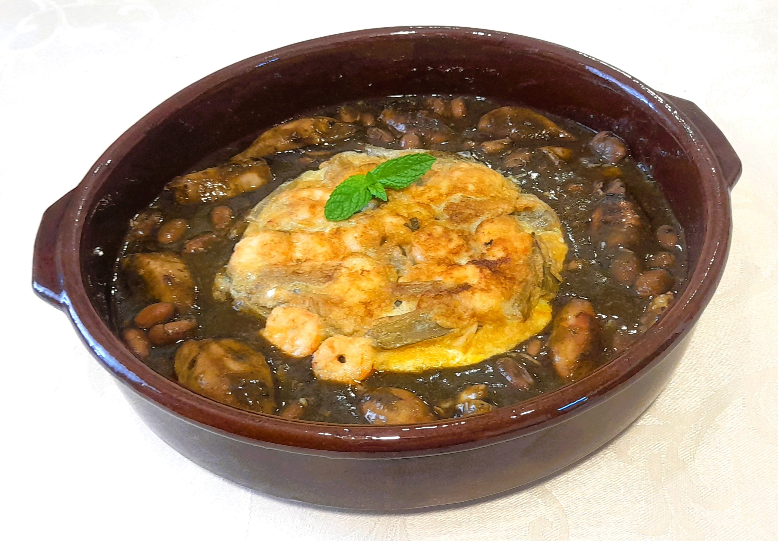 En una sartén doramos un ajo picadito, las gambas y las borrajas y con los cuatro huevos hacemos una tortilla que agregaremos al guiso de los chipirones junto con los boliches, daremos un breve hervor, dejamos reposar 5 minutos y emplatamos: 1/4 de tortilla por comensal, los chipirones y adornamos con el perejil.